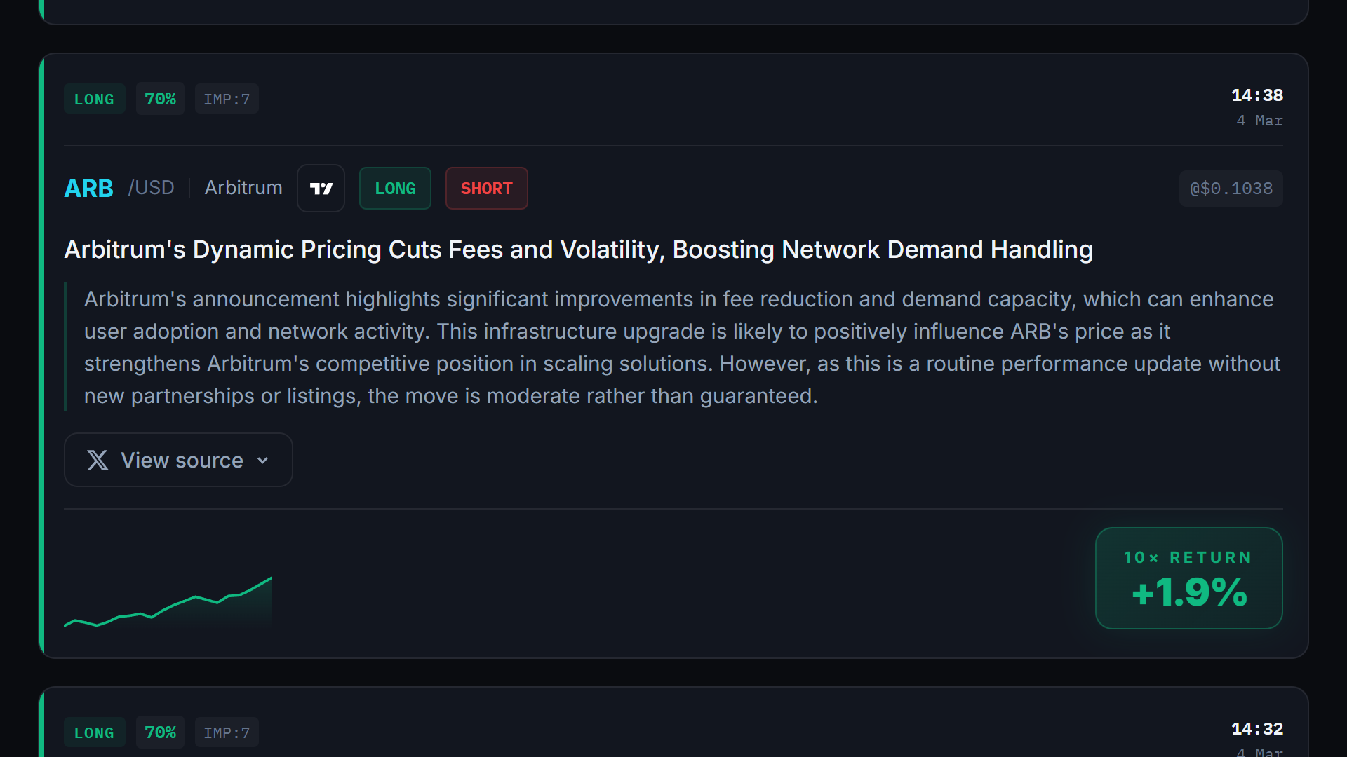 Decryptr reads the tweet, rates its sentiment, and puts a Long or Short button directly in your feed — connected live to Hyperliquid. No tab switching. No missed entries.